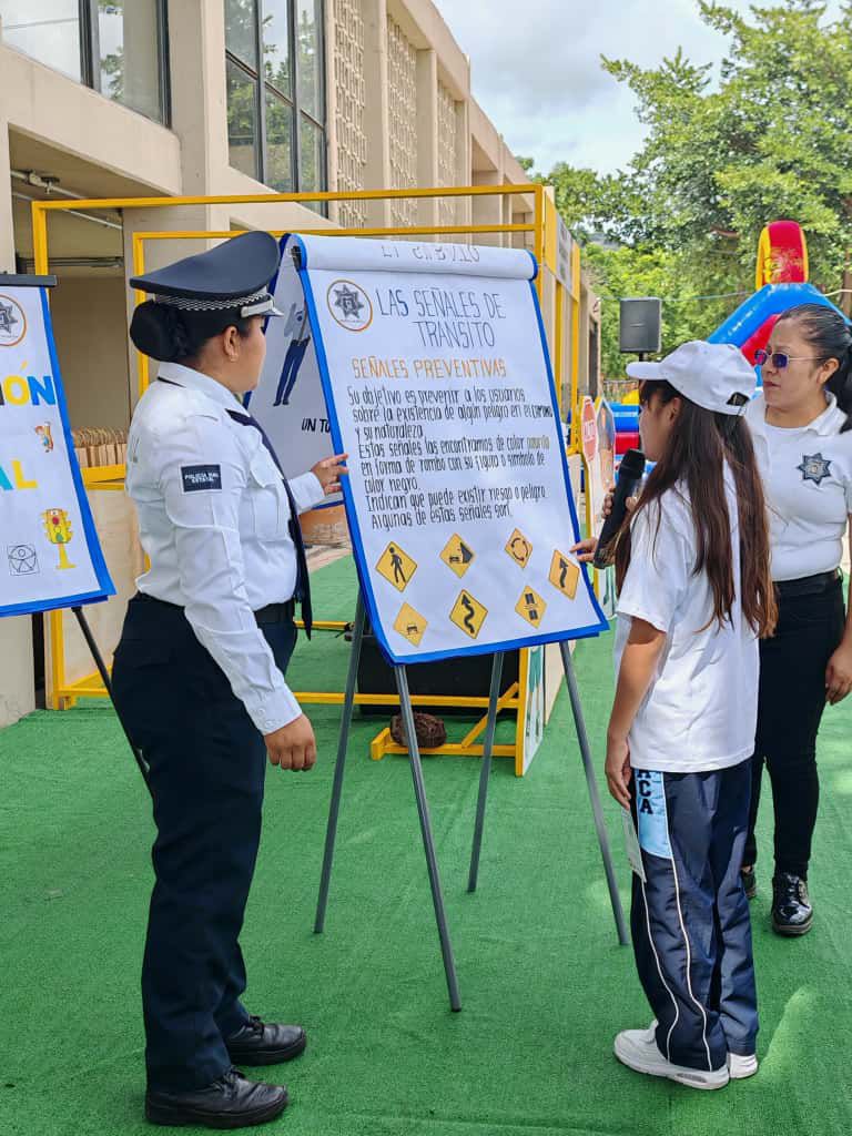 Como parte de esta estrategia, personal de la corporación encabezada por Toribio López Sánchez ofrece pláticas de educación vial e instala un circuito infantil, donde las y los participantes conocen de forma práctica las normas básicas de tránsito y el uso adecuado de los espacios públicos.