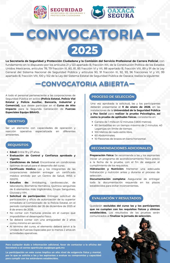 Oaxaca de Juárez, Oaxaca; 8 de diciembre de 2025. La Secretaría de Seguridad y Protección Ciudadana (SSPC) en conjunto con la Comisión del Servicio Profesional de Carrera Policial, abrió la convocatoria dirigida a integrantes de la Policía Estatal, Policía Vial Estatal y Policía Auxiliar, Bancaria, Industrial y Comercial (PABIC); para participar en el Curso de Alto Impacto para la Segunda Generación de Fuerzas Especiales Equipo BRAVO.