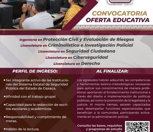 • La oferta académica incluye la Ingeniería en Protección Civil y Evaluación de Riesgos; así como las licenciaturas en Ciberseguridad, Criminalística e Investigación Policial, Derecho y Seguridad Ciudadana