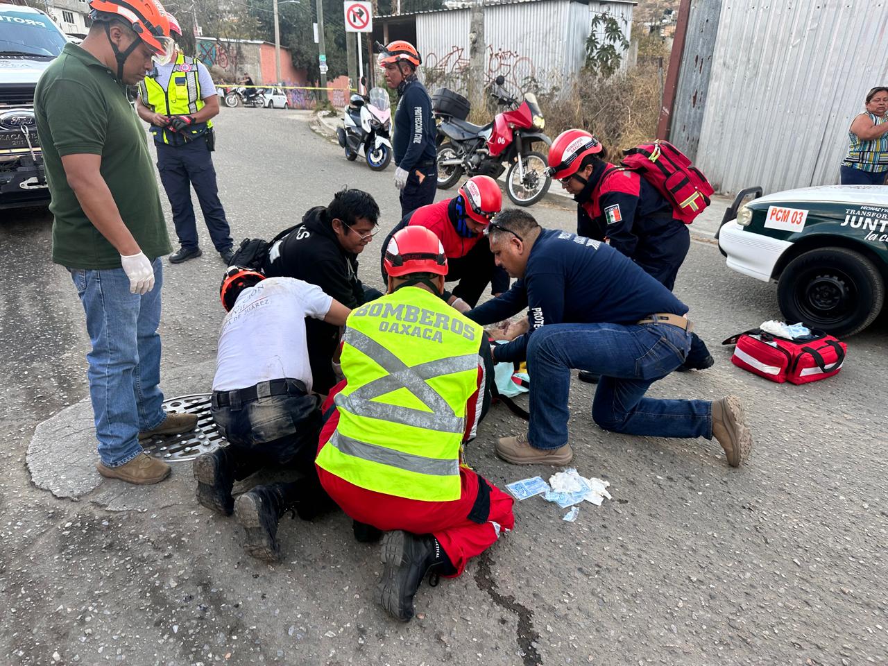 Oaxaca de Juárez, Oaxaca; 23 de enero de 2026. Elementos del Heroico Cuerpo de Bomberos de Oaxaca (HCBO) y personal de Protección Civil de Oaxaca de Juárez atendieron el reporte de una persona atrapada en una alcantarilla, quien fue rescata con vida y trasladada a un nosocomio donde recibe la atención médica necesaria.
