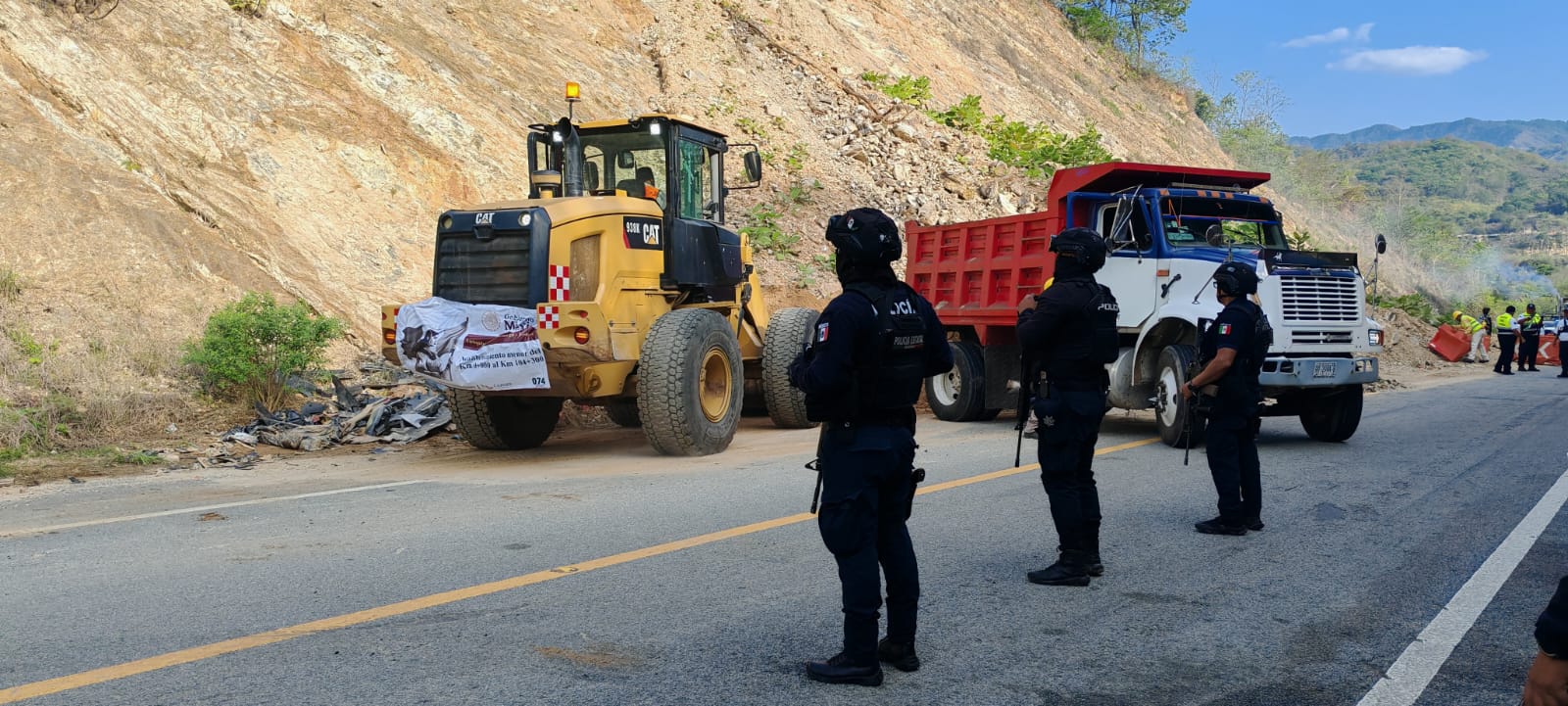 ANUNCIA SSPC PRESENCIA DE CUERPOS POLICIALES Y DE AUXILIO EN TRABAJOS DE ATENCIÓN A DERRUMBES EN LA SUPERCARRETERA BARRANCA LARGA – VENTANILLA